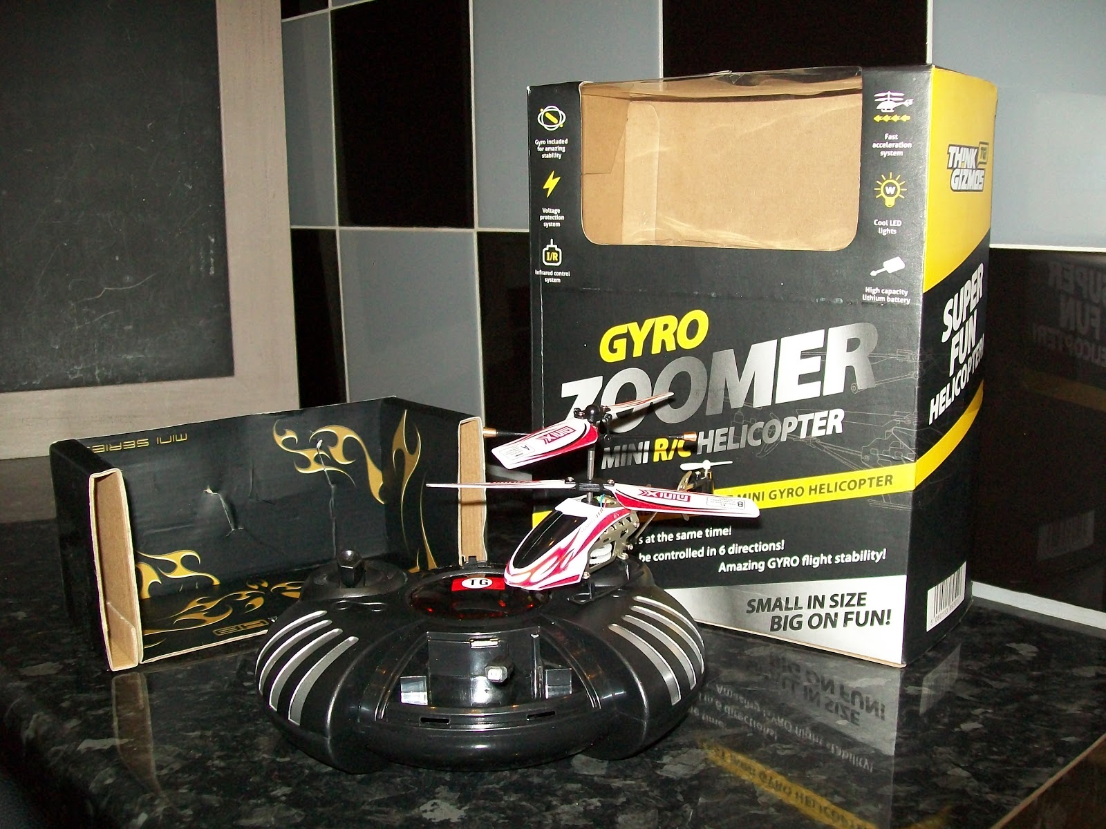 Firstly, the Gyro Zoomer R/C Helicopter is tiny! A lightweight design and sits nicely on the palm of my hand. The Gyro Zoomer comes complete boast the following: